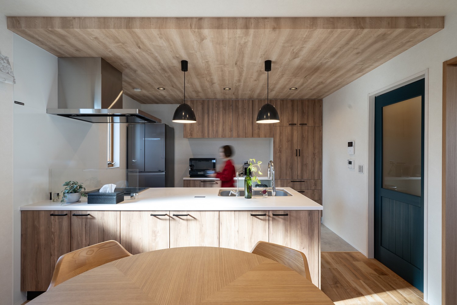 キッチン、カップボード、天井、床材の色味を合わせて、統一感のあるダイニングキッチンのスペースを創り出しています。キッチン横のカラードアは本物の木を使用したもので、お部屋のアクセントになっています◎