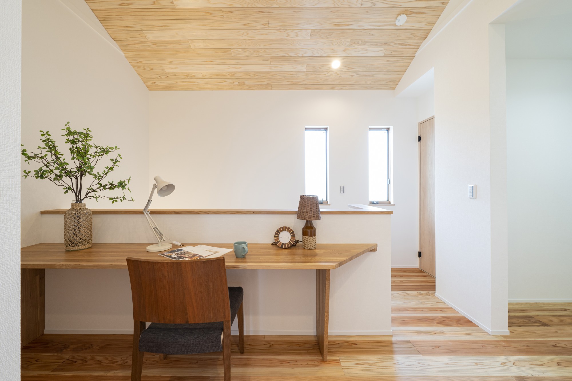 階段を上がった2階のホールにワークスペースを配置。開放的な勾配天井がゆったりとした空間を演出しています。